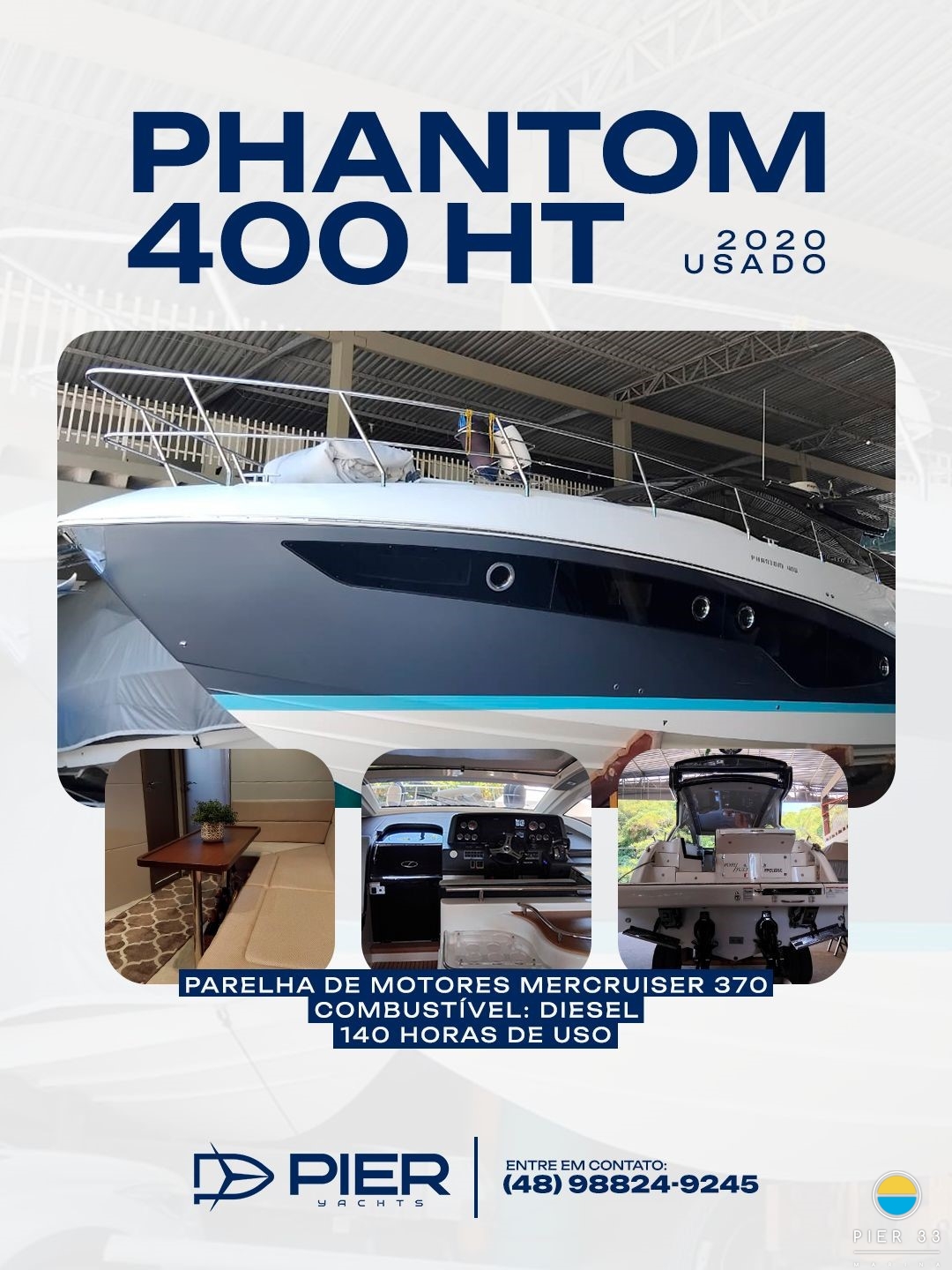 Phantom 360 Ano 2010 Único dono Parelha mercruiser 270 hp diesel com 540 horas Gerador 159 horas Ar Fogão elétrico Churrasqueira elétrica Boiler Guincho elétrico Teka plataforma e cockpit Geladeira GPS Som VHF microondas Capa Carreta Tv