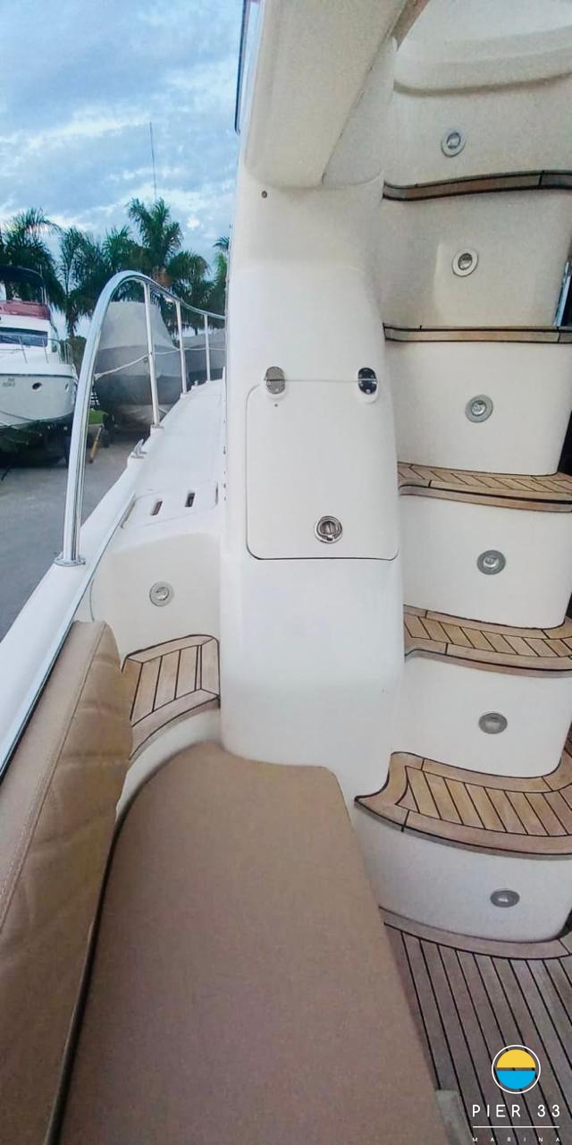 Joystick, estabilizador, dessalinizador, antena SKY, radar, chuveiro na plataforma, plataforma móvel, strobo, antena e rádio VHF, churrasqueira, ar condicionado, flaps, guincho, fechamento total, kit salvatagem, teca, toldo, tomada de cais, cozinha completa, área gourmet completa, TV em todos os quartos + sala, tomada 12V, som. | SEM: capa, carreta.
